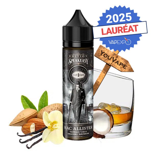 Le e-liquide Mac Allister 50ml de la gamme Speakeasy par Curieux mêle la vanille, la noix de coco, l’amande et du bourbon dans un classic gourmand primé au Vapexpo 2025.